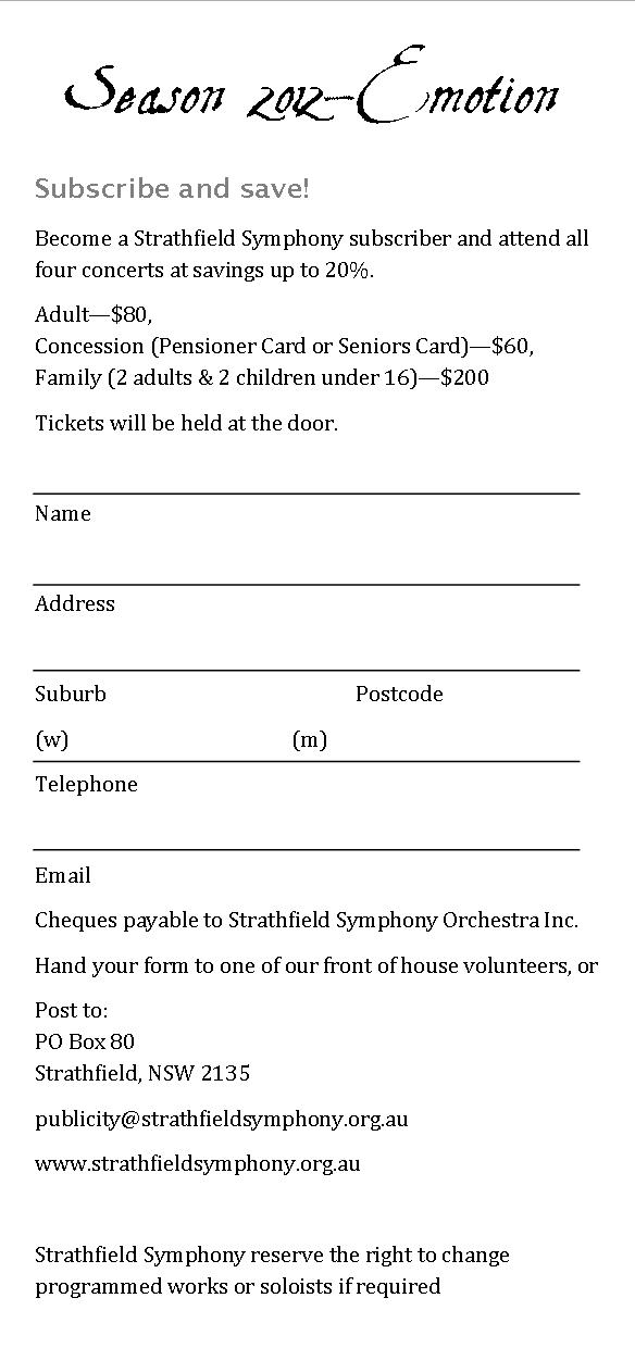 Attached is our flyer with the concert dates, which are 24 and 25 March, 23 & 24 June, 8 & 9 September and 24 & 25 November. Put the dates in your diary and please join us for a year of fabulous music. We’ve also attached a subscription form so that you can book in advance at attractive savings.